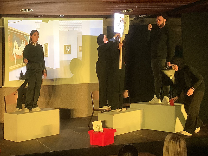 „Das Stück sticht vor allem dadurch hervor, dass es nicht nur aus klassischem, szenischem Spiel besteht, sondern auch aus künstlerischen Elementen der Bereiche Tanz bzw. bildende Kunst.“, so Elena Giuri. Die weniger lineare, sondern vielmehr collageartige und psychologisch angelegte Inszenierung forderte den Zuschauer heraus: mitzudenken und eigene Antworten zu den gestellten Fragen zu entwickeln.
