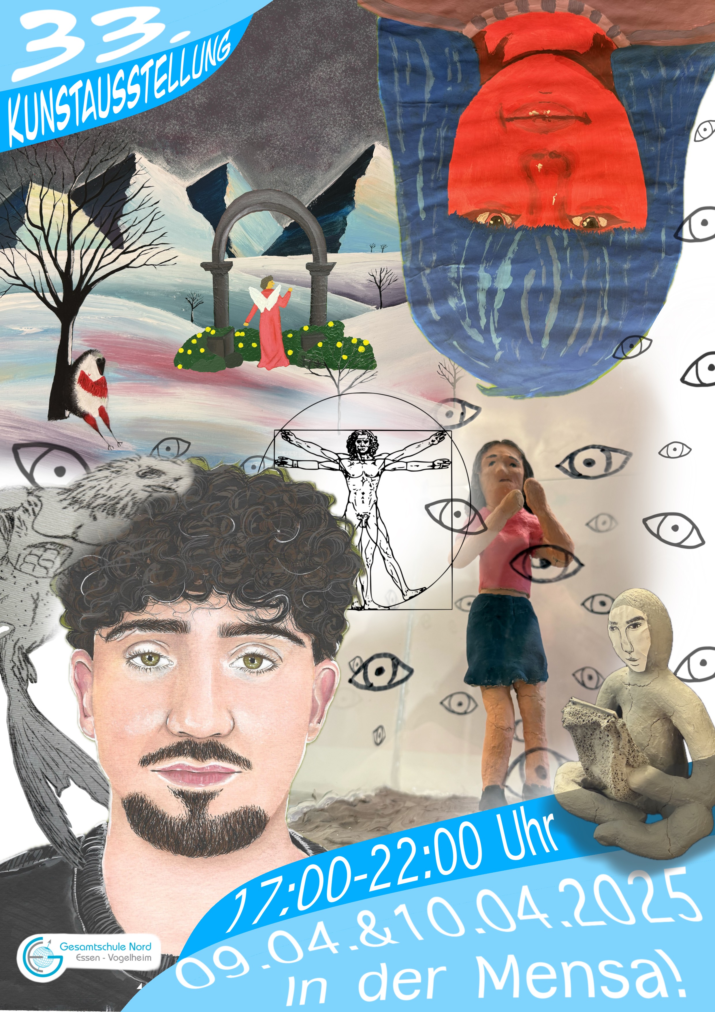 Die Kunst-Kurse präsentieren am 09.04. + 10.04.25 ihre Arbeiten auf der alljährlichen Kunstausstellung! Erleben Sie neben dem Schulkonzert die kreative Vielfalt der Gesamtschule Nord. Die Teams der Hauswirtschaft und der Mensa sorgen außerdem für das leibliche Wohl mit Getränken und Snacks.