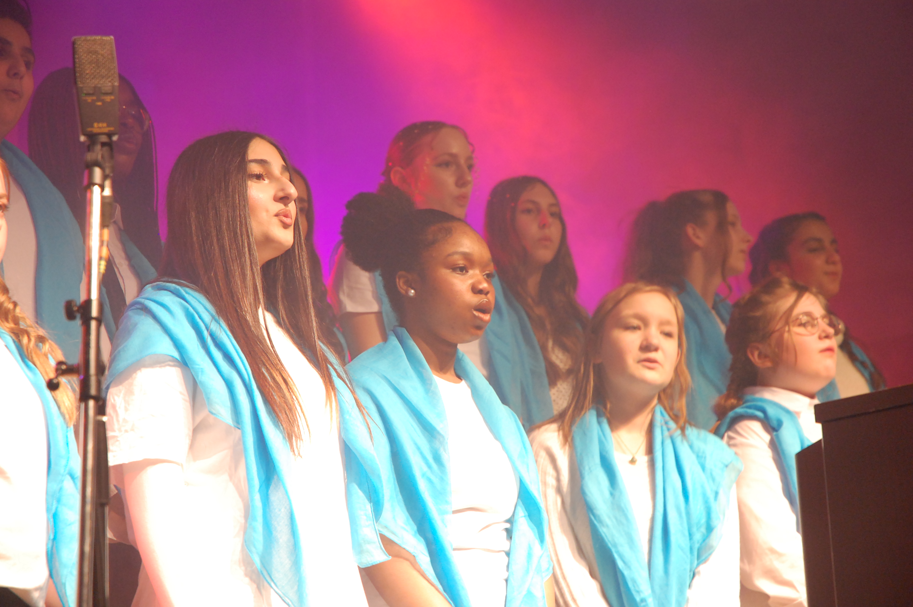 Die riesige, professionelle Bühne erstrahlte im Licht der bunten Scheinwerfer, die Instrumente eingehüllt im aufsteigenden Dampf der Nebelmaschinen. Das Intro „The final Countdown“ leitete in den Abend ein. Ob der Schulchor mit der mehrstimmig vorgetragenen Soul-Ballade „Lean on me“, die Tanz-AG mit modernen Tänzen und beeindruckenden akrobatischen Einlagen zu Hip-Hop-Rhythmen, die Musikkurse der Jahrgänge wie beispielsweise der Musikpraktische Kurs der Oberstufe: durchgängig begeisterten die Schüler:innen mit ihren musikalischen Darbietungen. Umjubelt auch Comfort und Sara Destiny, die den gesanglich äußerst anspruchsvollen Soul-Song „I know him so well“ sicher, authentisch und gefühlvoll vorzutragen wussten.