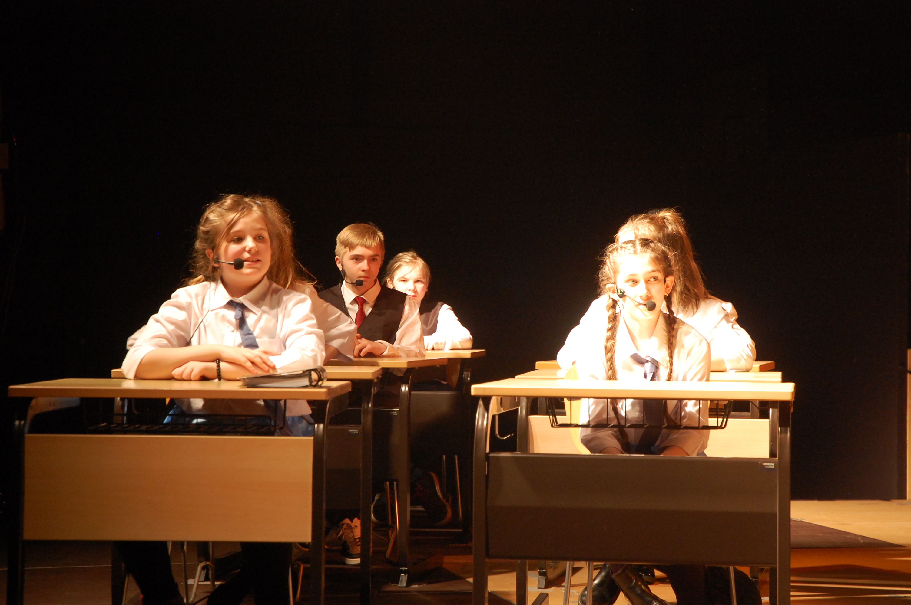 Im Zentrum des zweiten Konzertteils stand das Musical „School of Rock“, „schauspielerisch und musikalisch vollständig eigenständig dargeboten von Schüler:innen“, so Wolfgang Pappe. „Dabei waren Schüler:innen des WP-Kurses im 9. Jahrgang sowie aus dem Projektunterricht der 6. bis 9. Klassen. Sie waren alle freiwillig dabei, ohne Benotung, sehr engagiert, haben in jeder Pause, bei jeder Gelegenheit geübt“, betont die Lehrerin Elena Giuri, die federführend in Sachen Drehbuch, Bühne und Requisite gemeinsam mit den Kollegen Wolfgang Pappe und Thomas Döller das Stück auf die Bühne brachte. Herausragend spielte in einer sehr großen Rolle überaus authentisch Rüzgar als Dewey Finn, leidenschaftlicher Rockgitarrist und Sänger, aber stets knapp bei Kasse. Außerdem überzeugend waren Yannic als Deweys langjähriger Freund, der als Aushilfslehrer tätige Ned Schneebly, und Luna in der Rolle von Neds dominanter Freundin Patty, die sich so gar nicht mit Deweys unkonventioneller Lebensweise anfreunden möchte sowie die vielen weiteren Darsteller und Sänger:innen.