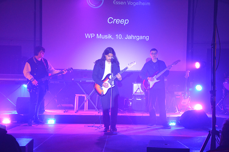 Und so konnte die Party im Jahr 2025 steigen. Licht aus, Spots an: die große, professionelle Bühne erstrahlt im Licht der bunten Scheinwerfer, die Instrumente eingehüllt im aufsteigenden Dampf der Nebelmaschinen. Ob der Schulchor mit „A Million Dreams“ und „You will be in my heart“, die Tanz-AG mit modernen Tänzen und beeindruckenden akrobatischen Einlagen, die Musikkurse der Jahrgänge: durchgängig begeisterten die Talente mit ihren musikalischen Darbietungen aus der Welt des Rock und Pop. Herausragend waren das Konzept und die Darbietungen nach der Pause: hier stand das Musical „Bodyguard“ im Mittelpunkt, in Schauspiel, Tanz und Gesang von allen überaus überzeugend dargeboten. Insbesondere Sarah Destiny wusste in der Rolle der „Rachel“ gesanglich einen Höhepunkt nach dem anderen zu setzen und trug selbst anspruchsvollste Passagen mit Leichtigkeit und mitreißend vor. Das liebevoll gestaltete Bühnenbild sowie authentische Kostüme gehörten selbstverständlich dazu.